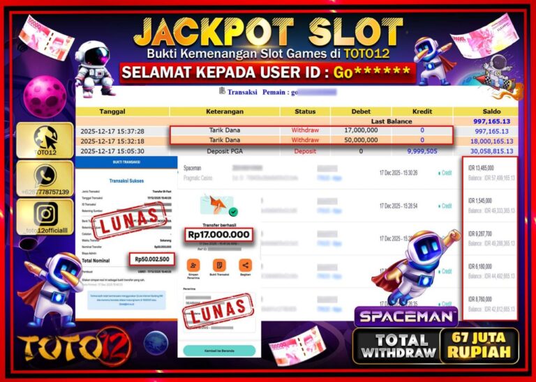 Selamat kepada Member Kami Go****** Telah Jackpot dan berhasil mendapatkan kemenangan besar pada permainan JACKPOT SLOT GAME (SPACEMAN) Dengan Kemenangan Sebesar Rp.67.000.000 –. Setelah mengisi Fomulir Withdraw dengan Kurang waktu 1-2 Menit Dana sudah kami Trasnfer kepada Pemilik Userid dan dana sudah dapat di cairkan oleh pemenang. Bukti Pembayaran yang TOTO12 berikan merupakan Bukti Pembayaran yang SAH…