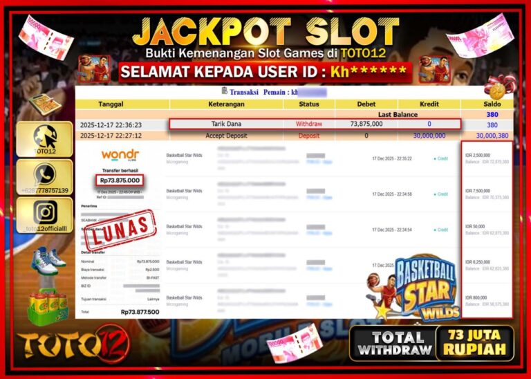 Selamat kepada Member Kami Kh****** Telah Jackpot dan berhasil mendapatkan kemenangan besar pada permainan JACKPOT SLOT GAME (BASKETBALL STAR WILDS) Dengan Kemenangan Sebesar Rp.73.875.000 –. Setelah mengisi Fomulir Withdraw dengan Kurang waktu 1-2 Menit Dana sudah kami Trasnfer kepada Pemilik Userid dan dana sudah dapat di cairkan oleh pemenang. Bukti Pembayaran yang TOTO12 berikan merupakan Bukti…