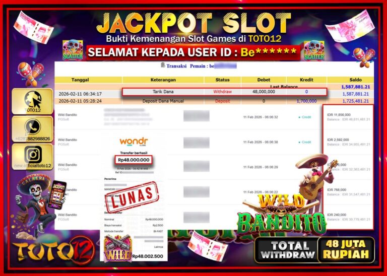 Selamat kepada Member Kami Be***** Telah Jackpot dan berhasil mendapatkan kemenangan besar pada permainan JACKPOT SLOT GAME (WILD BOUNTY SHOWDOWN) Dengan Kemenangan Sebesar Rp.48.000.000–. Setelah mengisi Fomulir Withdraw dengan Kurang waktu 1-2 Menit Dana sudah kami Trasnfer kepada Pemilik Userid dan dana sudah dapat di cairkan oleh pemenang. Bukti Pembayaran yang TOTO12 berikan merupakan Bukti Pembayaran…
