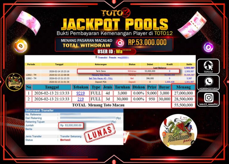 Selamat kepada Member Kami Wa****** Telah Jackpot dan berhasil mendapatkan kemenangan besar pada permainan JACKPOT POOLS PASARAN (TOTOMACAU 4D) Dengan Kemenangan Sebesar Rp.53.000.000–. Setelah mengisi Fomulir Withdraw dengan Kurang waktu 1-2 Menit Dana sudah kami Trasnfer kepada Pemilik Userid dan dana sudah dapat di cairkan oleh pemenang. Bukti Pembayaran yang TOTO12 berikan merupakan Bukti Pembayaran yang SAH…