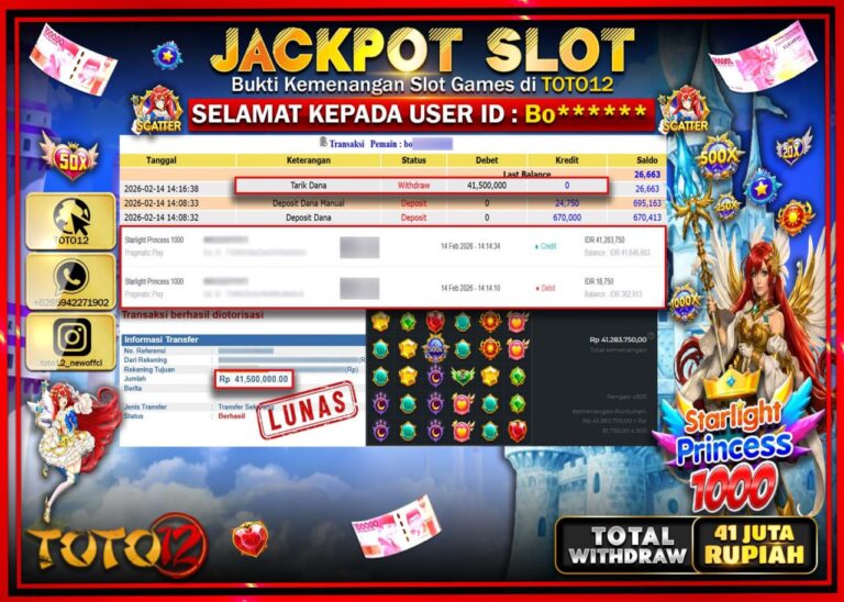 Selamat kepada Member Kami Bo****** Telah Jackpot dan berhasil mendapatkan kemenangan besar pada permainan JACKPOT SLOT GAME (STARLIGHT PRINCESS 1000) Dengan Kemenangan Sebesar Rp.41.500.000–. Setelah mengisi Fomulir Withdraw dengan Kurang waktu 1-2 Menit Dana sudah kami Trasnfer kepada Pemilik Userid dan dana sudah dapat di cairkan oleh pemenang. Bukti Pembayaran yang TOTO12 berikan merupakan Bukti Pembayaran…