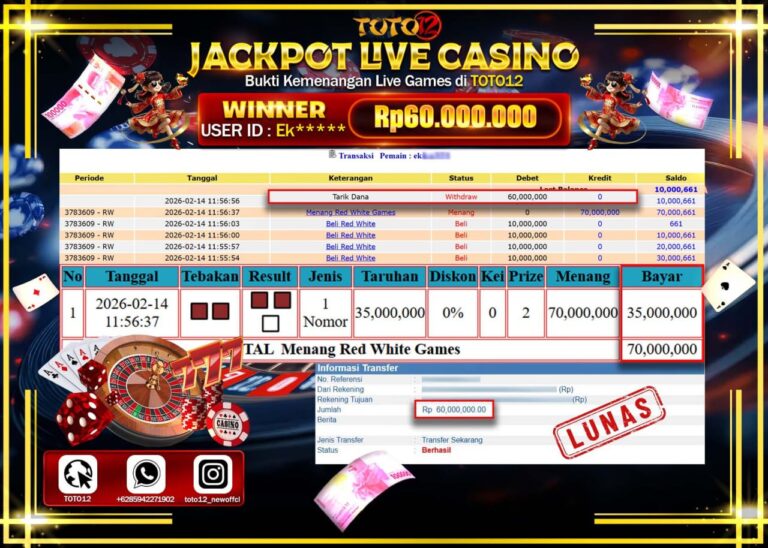 Selamat kepada Member Kami Ek***** Telah Jackpot dan berhasil mendapatkan kemenangan besar pada permainan JACKPOT LIVE GAME CASINO (RED WHITE) Dengan Kemenangan Sebesar Rp.60.000.000–. Setelah mengisi Fomulir Withdraw dengan Kurang waktu 1-2 Menit Dana sudah kami Trasnfer kepada Pemilik Userid dan dana sudah dapat di cairkan oleh pemenang. Bukti Pembayaran yang TOTO12 berikan merupakan Bukti Pembayaran…