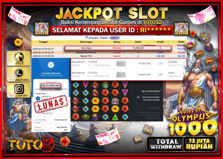 Selamat kepada Member Kami Ri****** Telah Jackpot dan berhasil mendapatkan kemenangan besar pada permainan JACKPOT SLOT GAME (GATES OF OLYMPUS 1000) Dengan Kemenangan Sebesar Rp.72.000.000–. Setelah mengisi Fomulir Withdraw dengan Kurang waktu 1-2 Menit Dana sudah kami Trasnfer kepada Pemilik Userid dan dana sudah dapat di cairkan oleh pemenang. Bukti Pembayaran yang TOTO12 berikan merupakan Bukti…
