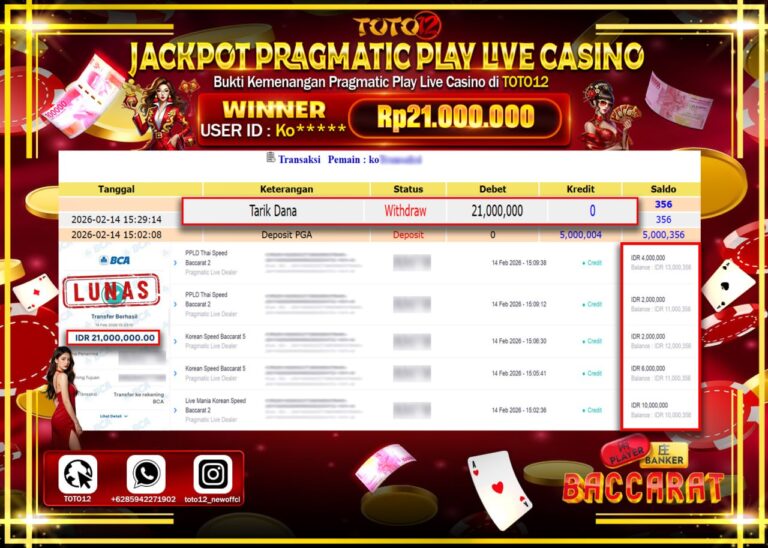 Selamat kepada Member Kami Ko***** Telah Jackpot dan berhasil mendapatkan kemenangan besar pada permainan JACKPOT LIVE GAME CASINO (PPLD THAI SPEED BACCARAT 2) Dengan Kemenangan Sebesar Rp.21.000.000–. Setelah mengisi Fomulir Withdraw dengan Kurang waktu 1-2 Menit Dana sudah kami Trasnfer kepada Pemilik Userid dan dana sudah dapat di cairkan oleh pemenang. Bukti Pembayaran yang TOTO12 berikan…