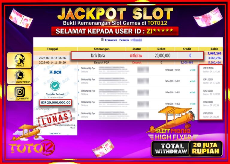 Selamat kepada Member Kami Zi****** Telah Jackpot dan berhasil mendapatkan kemenangan besar pada permainan JACKPOT SLOT GAME (SLOT MANIA HIGH FLYER) Dengan Kemenangan Sebesar Rp.20.000.000–. Setelah mengisi Fomulir Withdraw dengan Kurang waktu 1-2 Menit Dana sudah kami Trasnfer kepada Pemilik Userid dan dana sudah dapat di cairkan oleh pemenang. Bukti Pembayaran yang TOTO12 berikan merupakan Bukti…