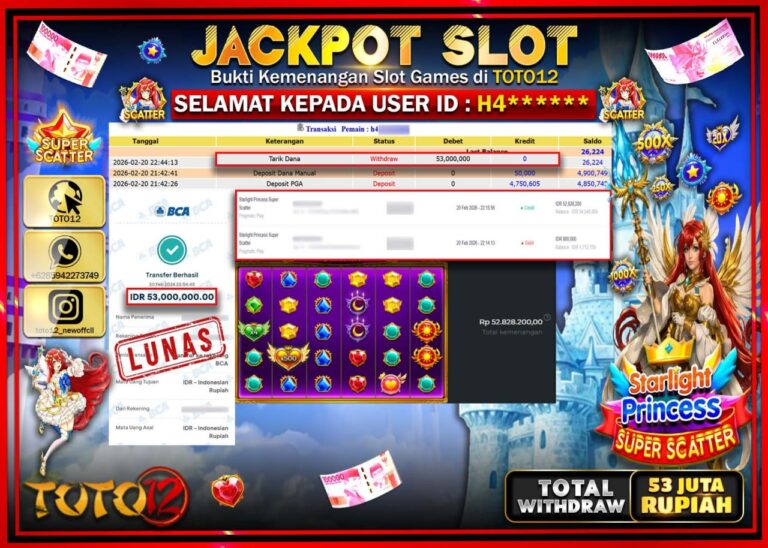 Selamat kepada Member Kami H4***** Telah Jackpot dan berhasil mendapatkan kemenangan besar pada permainan JACKPOT SLOT GAME (STARLIGHT PRINCES SUPER SCATTER) Dengan Kemenangan Sebesar Rp.53.000.000–. Setelah mengisi Fomulir Withdraw dengan Kurang waktu 1-2 Menit Dana sudah kami Trasnfer kepada Pemilik Userid dan dana sudah dapat di cairkan oleh pemenang. Bukti Pembayaran yang TOTO12 berikan merupakan Bukti…