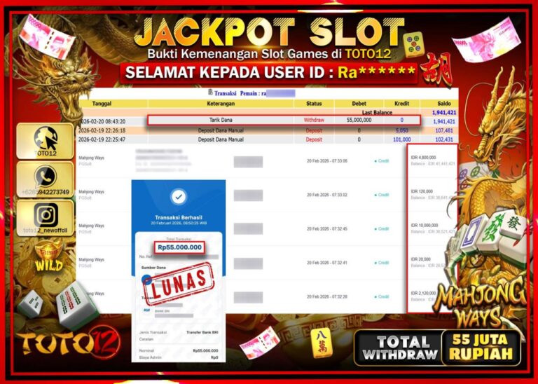 Selamat kepada Member Kami Ra***** Telah Jackpot dan berhasil mendapatkan kemenangan besar pada permainan JACKPOT SLOT GAME (MAHJONG WAYS) Dengan Kemenangan Sebesar Rp.55.000.000–. Setelah mengisi Fomulir Withdraw dengan Kurang waktu 1-2 Menit Dana sudah kami Trasnfer kepada Pemilik Userid dan dana sudah dapat di cairkan oleh pemenang. Bukti Pembayaran yang TOTO12 berikan merupakan Bukti Pembayaran yang SAH…