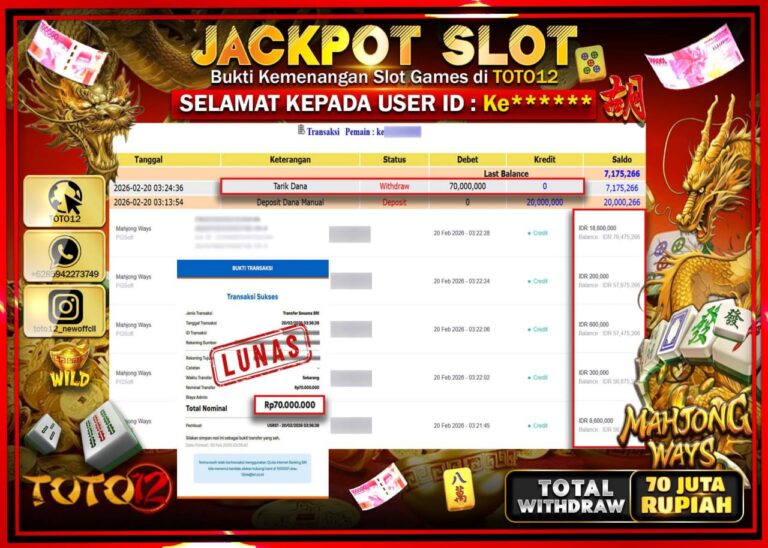 Selamat kepada Member Kami Ke***** Telah Jackpot dan berhasil mendapatkan kemenangan besar pada permainan JACKPOT SLOT GAME (MAHJONG WAYS) Dengan Kemenangan Sebesar Rp.70.000.000–. Setelah mengisi Fomulir Withdraw dengan Kurang waktu 1-2 Menit Dana sudah kami Trasnfer kepada Pemilik Userid dan dana sudah dapat di cairkan oleh pemenang. Bukti Pembayaran yang TOTO12 berikan merupakan Bukti Pembayaran yang SAH…