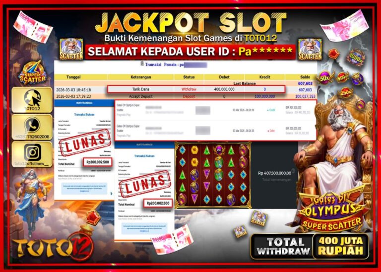Selamat kepada Member Kami Pa**** Telah Jackpot dan berhasil mendapatkan kemenangan besar pada permainan JACKPOT SLOT GAME (GATES OF OLYMPUS SUPER SCATTER) Dengan Kemenangan Sebesar Rp.400.000.000–. Setelah mengisi Fomulir Withdraw dengan Kurang waktu 1-2 Menit Dana sudah kami Trasnfer kepada Pemilik Userid dan dana sudah dapat di cairkan oleh pemenang. Bukti Pembayaran yang TOTO12 berikan merupakan…