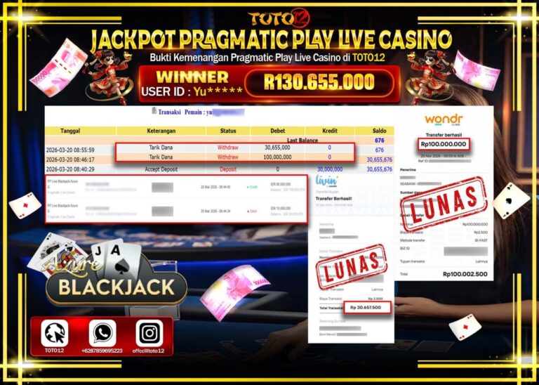Selamat kepada Member Kami Yu****** Telah Jackpot dan berhasil mendapatkan kemenangan besar pada permainan JACKPOT PRAGMATIC PLAY LIVE GAME CASINO (PP LIVE BLACKJACK AZURE) Dengan Kemenangan Sebesar Rp.130.655.000–. Setelah mengisi Fomulir Withdraw dengan Kurang waktu 1-2 Menit Dana sudah kami Trasnfer kepada Pemilik Userid dan dana sudah dapat di cairkan oleh pemenang. Bukti Pembayaran yang TOTO12…