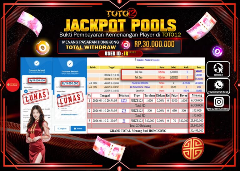 Selamat kepada Member Kami IR****** Telah Jackpot dan berhasil mendapatkan kemenangan besar pada permainan JACKPOT POOLS PASARAN ( HONGKONG ) Dengan Kemenangan Sebesar Rp.30.000.000–. Setelah mengisi Fomulir Withdraw dengan Kurang waktu 1-2 Menit Dana sudah kami Trasnfer kepada Pemilik Userid dan dana sudah dapat di cairkan oleh pemenang. Bukti Pembayaran yang TOTO12 berikan merupakan Bukti Pembayaran…