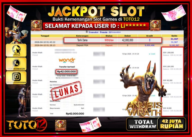 Selamat kepada Member Kami Li***** Telah Jackpot dan berhasil mendapatkan kemenangan besar pada permainan JACKPOT SLOT GAME (ANUBIS WARTH) Dengan Kemenangan Sebesar Rp.42.000.000–. Setelah mengisi Fomulir Withdraw dengan Kurang waktu 1-2 Menit Dana sudah kami Trasnfer kepada Pemilik Userid dan dana sudah dapat di cairkan oleh pemenang. Bukti Pembayaran yang TOTO12 berikan merupakan Bukti Pembayaran yang SAH…