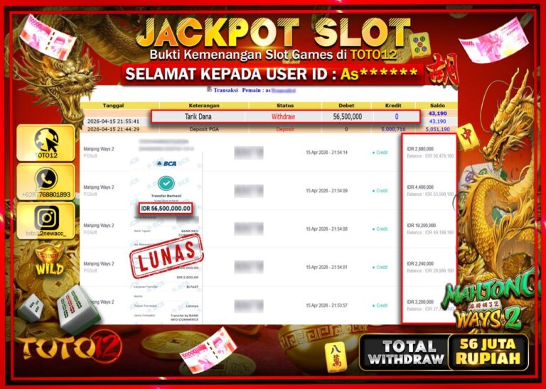 Selamat kepada Member Kami As***** Telah Jackpot dan berhasil mendapatkan kemenangan besar pada permainan JACKPOT SLOT GAME (MAHJONG WAYS 2) Dengan Kemenangan Sebesar Rp.56.500.000–. Setelah mengisi Fomulir Withdraw dengan Kurang waktu 1-2 Menit Dana sudah kami Trasnfer kepada Pemilik Userid dan dana sudah dapat di cairkan oleh pemenang. Bukti Pembayaran yang TOTO12 berikan merupakan Bukti Pembayaran…