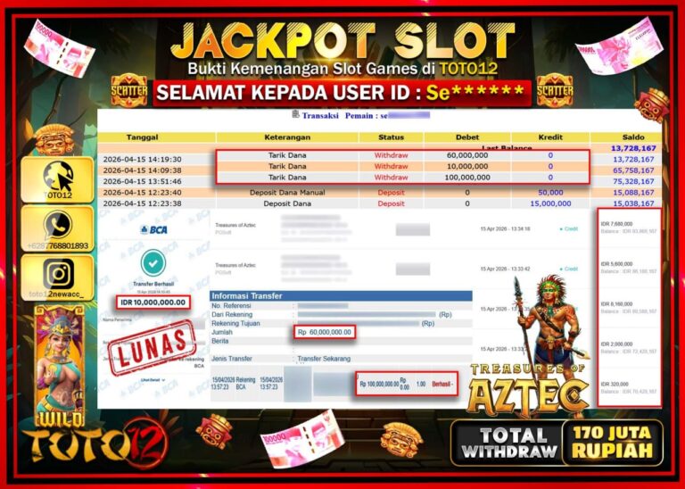 Selamat kepada Member Kami Se***** Telah Jackpot dan berhasil mendapatkan kemenangan besar pada permainan JACKPOT SLOT GAME (TREASURES OF AZTEC) Dengan Kemenangan Sebesar Rp.170.000.000–. Setelah mengisi Fomulir Withdraw dengan Kurang waktu 1-2 Menit Dana sudah kami Trasnfer kepada Pemilik Userid dan dana sudah dapat di cairkan oleh pemenang. Bukti Pembayaran yang TOTO12 berikan merupakan Bukti Pembayaran…