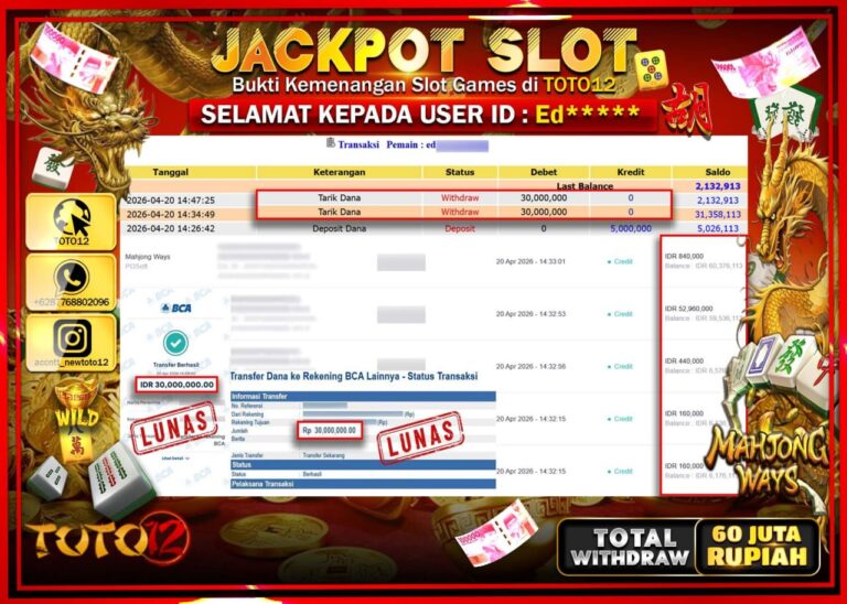 Selamat kepada Member Kami Ke***** Telah Jackpot dan berhasil mendapatkan kemenangan besar pada permainan JACKPOT SLOT GAME (MAHJONG WAYS) Dengan Kemenangan Sebesar Rp.60.000.000–. Setelah mengisi Fomulir Withdraw dengan Kurang waktu 1-2 Menit Dana sudah kami Trasnfer kepada Pemilik Userid dan dana sudah dapat di cairkan oleh pemenang. Bukti Pembayaran yang TOTO12 berikan merupakan Bukti Pembayaran yang SAH…