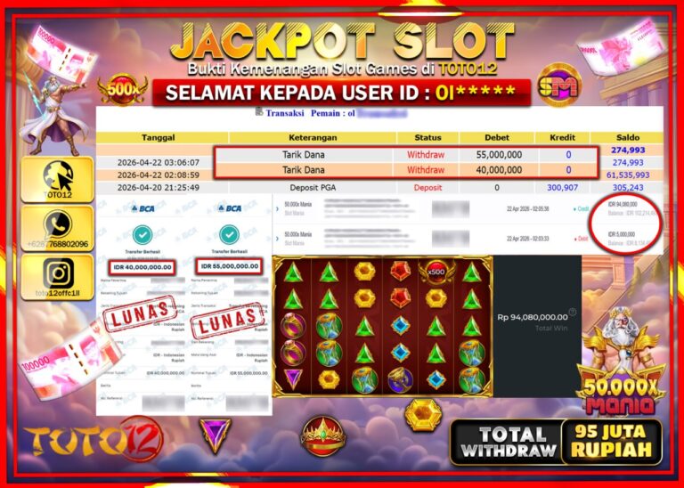 Selamat kepada Member Kami OI***** Telah Jackpot dan berhasil mendapatkan kemenangan besar pada permainan JACKPOT SLOT GAME (50.000 X MANIA) Dengan Kemenangan Sebesar Rp.95.000.000–. Setelah mengisi Fomulir Withdraw dengan Kurang waktu 1-2 Menit Dana sudah kami Trasnfer kepada Pemilik Userid dan dana sudah dapat di cairkan oleh pemenang. Bukti Pembayaran yang TOTO12 berikan merupakan Bukti Pembayaran…