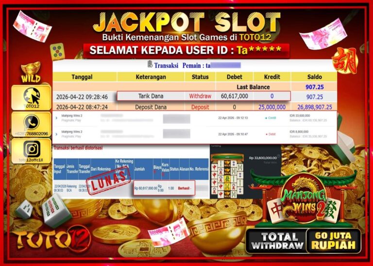 Selamat kepada Member Kami Ta***** Telah Jackpot dan berhasil mendapatkan kemenangan besar pada permainan JACKPOT SLOT GAME (MAHJONG WINS 2) Dengan Kemenangan Sebesar Rp.60.617.000–. Setelah mengisi Fomulir Withdraw dengan Kurang waktu 1-2 Menit Dana sudah kami Trasnfer kepada Pemilik Userid dan dana sudah dapat di cairkan oleh pemenang. Bukti Pembayaran yang TOTO12 berikan merupakan Bukti Pembayaran…