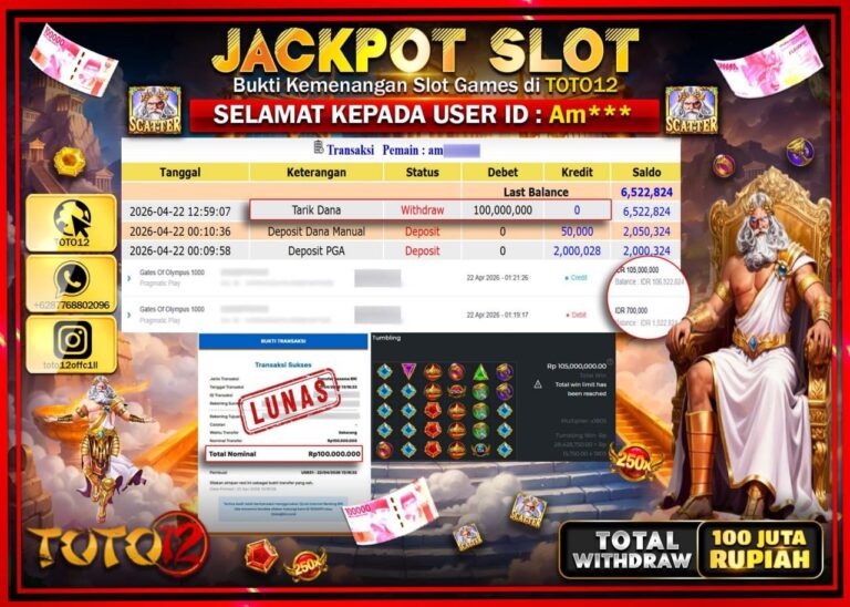 Selamat kepada Member Kami Am***** Telah Jackpot dan berhasil mendapatkan kemenangan besar pada permainan JACKPOT SLOT GAME (GATES OF OLYMPUS 1000) Dengan Kemenangan Sebesar Rp.100.000.000–. Setelah mengisi Fomulir Withdraw dengan Kurang waktu 1-2 Menit Dana sudah kami Trasnfer kepada Pemilik Userid dan dana sudah dapat di cairkan oleh pemenang. Bukti Pembayaran yang TOTO12 berikan merupakan Bukti…