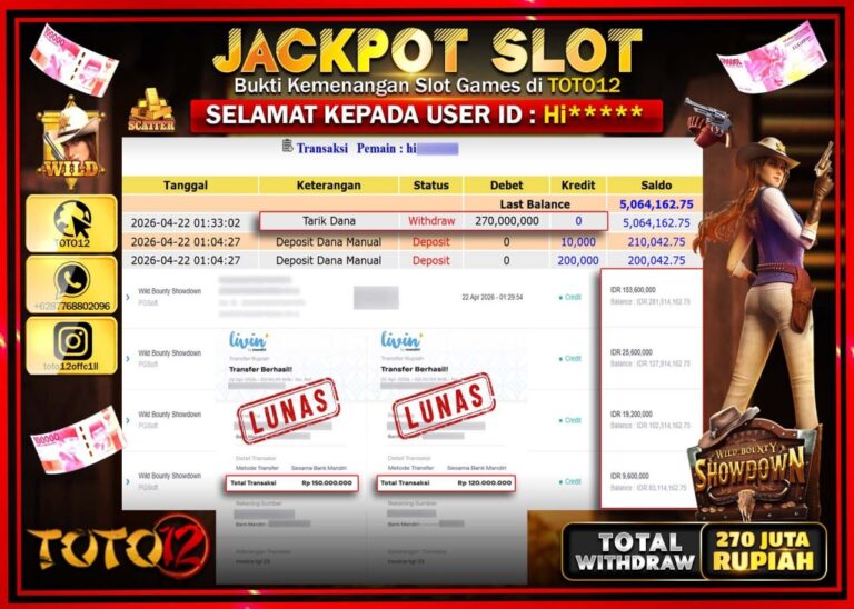 Selamat kepada Member Kami Hi***** Telah Jackpot dan berhasil mendapatkan kemenangan besar pada permainan JACKPOT SLOT GAME (WILD BOUNTY SHOWDOWN) Dengan Kemenangan Sebesar Rp.270.000.000–. Setelah mengisi Fomulir Withdraw dengan Kurang waktu 1-2 Menit Dana sudah kami Trasnfer kepada Pemilik Userid dan dana sudah dapat di cairkan oleh pemenang. Bukti Pembayaran yang TOTO12 berikan merupakan Bukti Pembayaran…