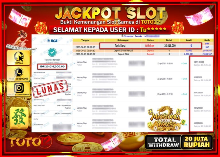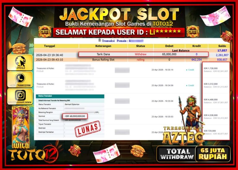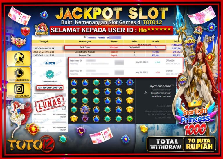 Selamat kepada Member Kami Be***** Telah Jackpot dan berhasil mendapatkan kemenangan besar pada permainan JACKPOT SLOT GAME (WISDOM OF ATHENA) Dengan Kemenangan Sebesar Rp.50.500.000–. Setelah mengisi Fomulir Withdraw dengan Kurang waktu 1-2 Menit Dana sudah kami Trasnfer kepada Pemilik Userid dan dana sudah dapat di cairkan oleh pemenang. Bukti Pembayaran yang TOTO12 berikan merupakan Bukti Pembayaran…