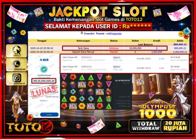 Selamat kepada Member Kami Ra****** Telah Jackpot dan berhasil mendapatkan kemenangan besar pada permainan JACKPOT SLOT GAME (GATES OF OLYMPUS 1000) Dengan Kemenangan Sebesar Rp.20.000.000 –. Setelah mengisi Fomulir Withdraw dengan Kurang waktu 1-2 Menit Dana sudah kami Trasnfer kepada Pemilik Userid dan dana sudah dapat di cairkan oleh pemenang. Bukti Pembayaran yang TOTO12 berikan merupakan…