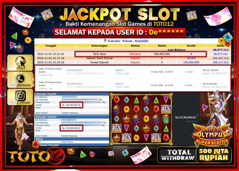 Selamat kepada Member Kami De****** Telah Jackpot dan berhasil mendapatkan kemenangan besar pada permainan JACKPOT SLOT GAME (GATES OF OLYMPUS SUPER SCATTER) Dengan Kemenangan Sebesar Rp.500.000.000 –. Setelah mengisi Fomulir Withdraw dengan Kurang waktu 1-2 Menit Dana sudah kami Trasnfer kepada Pemilik Userid dan dana sudah dapat di cairkan oleh pemenang. Bukti Pembayaran yang TOTO12 berikan…