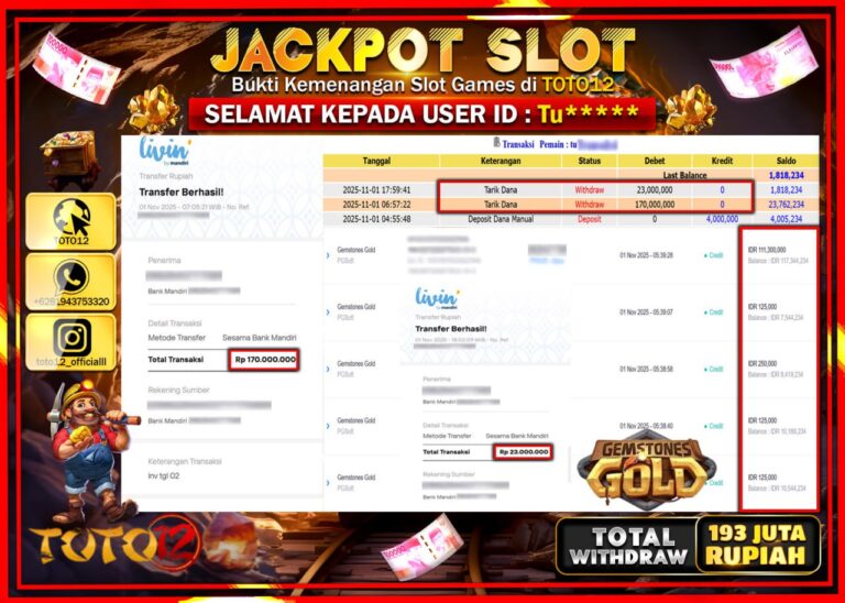 Selamat kepada Member Kami Tu****** Telah Jackpot dan berhasil mendapatkan kemenangan besar pada permainan JACKPOT SLOT GAME (GEMSTONES GOLD) Dengan Kemenangan Sebesar Rp.193.000.000 –. Setelah mengisi Fomulir Withdraw dengan Kurang waktu 1-2 Menit Dana sudah kami Trasnfer kepada Pemilik Userid dan dana sudah dapat di cairkan oleh pemenang. Bukti Pembayaran yang TOTO12 berikan merupakan Bukti Pembayaran…