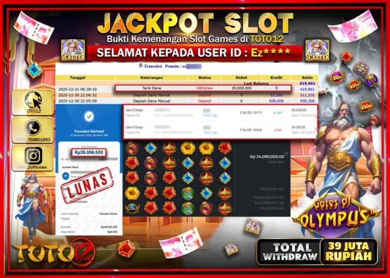 Selamat kepada Member Kami Ez****** Telah Jackpot dan berhasil mendapatkan kemenangan besar pada permainan JACKPOT SLOT GAME (GATES OF OLYMPUS) Dengan Kemenangan Sebesar Rp.39.000.000 –. Setelah mengisi Fomulir Withdraw dengan Kurang waktu 1-2 Menit Dana sudah kami Trasnfer kepada Pemilik Userid dan dana sudah dapat di cairkan oleh pemenang. Bukti Pembayaran yang TOTO12 berikan merupakan Bukti…