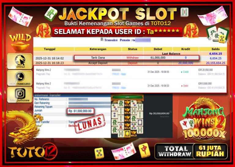 Selamat kepada Member Kami Ta****** Telah Jackpot dan berhasil mendapatkan kemenangan besar pada permainan JACKPOT SLOT GAME (MAHJONG WINS 2) Dengan Kemenangan Sebesar Rp.61.000.000 –. Setelah mengisi Fomulir Withdraw dengan Kurang waktu 1-2 Menit Dana sudah kami Trasnfer kepada Pemilik Userid dan dana sudah dapat di cairkan oleh pemenang. Bukti Pembayaran yang TOTO12 berikan merupakan Bukti…