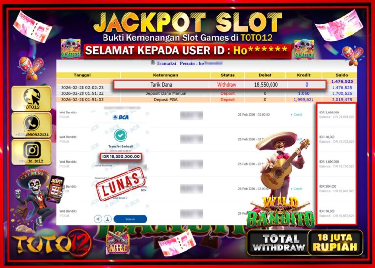 Selamat kepada Member Kami Ho**** Telah Jackpot dan berhasil mendapatkan kemenangan besar pada permainan JACKPOT SLOT GAME (WILD BANDITO) Dengan Kemenangan Sebesar Rp.18.550.000–. Setelah mengisi Fomulir Withdraw dengan Kurang waktu 1-2 Menit Dana sudah kami Trasnfer kepada Pemilik Userid dan dana sudah dapat di cairkan oleh pemenang. Bukti Pembayaran yang TOTO12 berikan merupakan Bukti Pembayaran yang SAH…