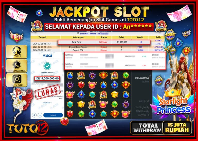 Selamat kepada Member Kami An**** Telah Jackpot dan berhasil mendapatkan kemenangan besar pada permainan JACKPOT SLOT GAME (STARLIGHT PRINCESS) Dengan Kemenangan Sebesar Rp.15.000.000–. Setelah mengisi Fomulir Withdraw dengan Kurang waktu 1-2 Menit Dana sudah kami Trasnfer kepada Pemilik Userid dan dana sudah dapat di cairkan oleh pemenang. Bukti Pembayaran yang TOTO12 berikan merupakan Bukti Pembayaran yang SAH…