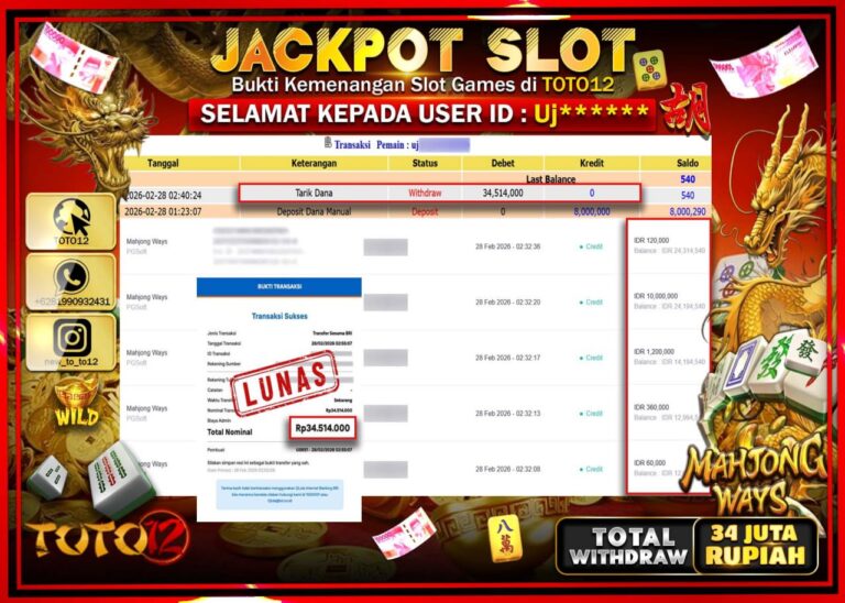 Selamat kepada Member Kami Uj**** Telah Jackpot dan berhasil mendapatkan kemenangan besar pada permainan JACKPOT SLOT GAME (MAHJONG WAYS) Dengan Kemenangan Sebesar Rp.34.514.000–. Setelah mengisi Fomulir Withdraw dengan Kurang waktu 1-2 Menit Dana sudah kami Trasnfer kepada Pemilik Userid dan dana sudah dapat di cairkan oleh pemenang. Bukti Pembayaran yang TOTO12 berikan merupakan Bukti Pembayaran yang SAH…