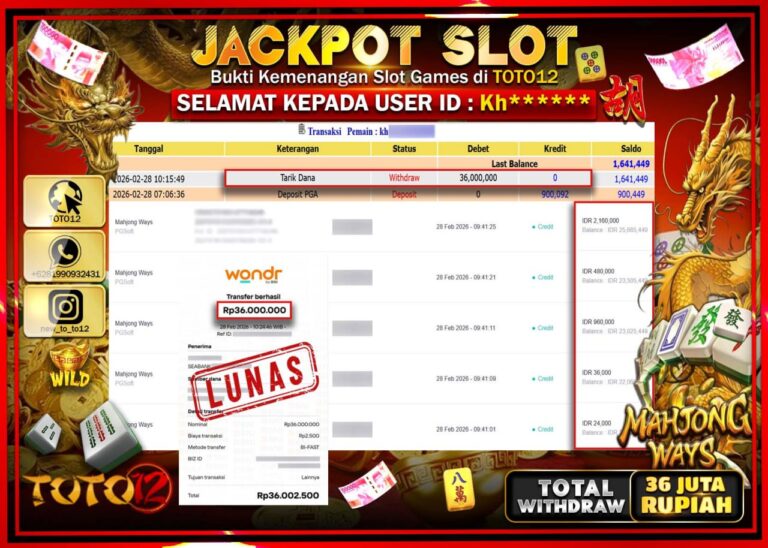 Selamat kepada Member Kami Kh**** Telah Jackpot dan berhasil mendapatkan kemenangan besar pada permainan JACKPOT SLOT GAME (MAHJONG WAYS) Dengan Kemenangan Sebesar Rp.36.000.000–. Setelah mengisi Fomulir Withdraw dengan Kurang waktu 1-2 Menit Dana sudah kami Trasnfer kepada Pemilik Userid dan dana sudah dapat di cairkan oleh pemenang. Bukti Pembayaran yang TOTO12 berikan merupakan Bukti Pembayaran yang SAH…