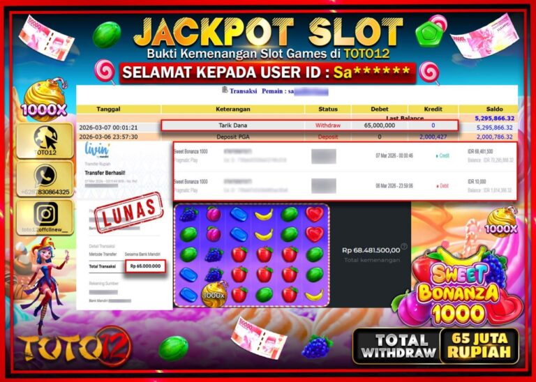 Selamat kepada Member Kami Sa**** Telah Jackpot dan berhasil mendapatkan kemenangan besar pada permainan JACKPOT SLOT GAME (SWEET BONANZA 1000) Dengan Kemenangan Sebesar Rp.65.000.000–. Setelah mengisi Fomulir Withdraw dengan Kurang waktu 1-2 Menit Dana sudah kami Trasnfer kepada Pemilik Userid dan dana sudah dapat di cairkan oleh pemenang. Bukti Pembayaran yang TOTO12 berikan merupakan Bukti Pembayaran…