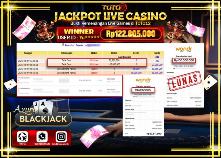 Selamat kepada Member Kami Yu**** Telah Jackpot dan berhasil mendapatkan kemenangan besar pada permainan JACKPOT LIVE GAMES CASINO (PP LIVE BLACKJACK AZURE) Dengan Kemenangan Sebesar Rp.122.805.000–. Setelah mengisi Fomulir Withdraw dengan Kurang waktu 1-2 Menit Dana sudah kami Trasnfer kepada Pemilik Userid dan dana sudah dapat di cairkan oleh pemenang. Bukti Pembayaran yang TOTO12 berikan merupakan…