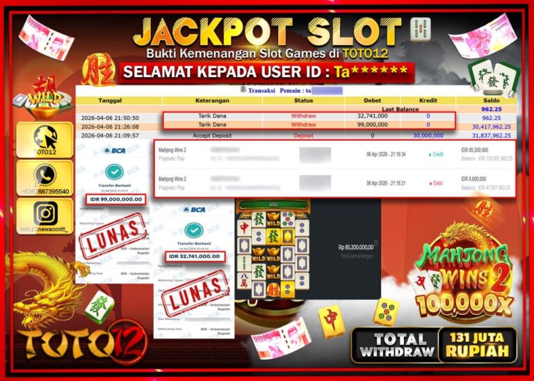 Selamat kepada Member Kami Ur***** Telah Jackpot dan berhasil mendapatkan kemenangan besar pada permainan JACKPOT SLOT GAME (MAHJONG WAYS) Dengan Kemenangan Sebesar Rp.131.800.000–. Setelah mengisi Fomulir Withdraw dengan Kurang waktu 1-2 Menit Dana sudah kami Trasnfer kepada Pemilik Userid dan dana sudah dapat di cairkan oleh pemenang. Bukti Pembayaran yang TOTO12 berikan merupakan Bukti Pembayaran yang SAH…
