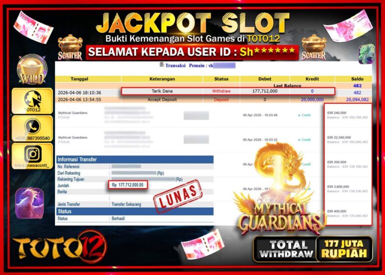 Selamat kepada Member Kami Sh***** Telah Jackpot dan berhasil mendapatkan kemenangan besar pada permainan JACKPOT SLOT GAME (MYTHICAL GUARDIANS) Dengan Kemenangan Sebesar Rp.177.712.000–. Setelah mengisi Fomulir Withdraw dengan Kurang waktu 1-2 Menit Dana sudah kami Trasnfer kepada Pemilik Userid dan dana sudah dapat di cairkan oleh pemenang. Bukti Pembayaran yang TOTO12 berikan merupakan Bukti Pembayaran yang SAH…