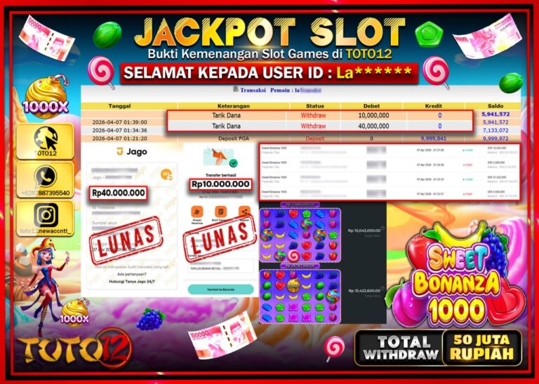 Selamat kepada Member Kami La***** Telah Jackpot dan berhasil mendapatkan kemenangan besar pada permainan JACKPOT SLOT GAME (SWEET BONANZA 1000) Dengan Kemenangan Sebesar Rp.50.000.000–. Setelah mengisi Fomulir Withdraw dengan Kurang waktu 1-2 Menit Dana sudah kami Trasnfer kepada Pemilik Userid dan dana sudah dapat di cairkan oleh pemenang. Bukti Pembayaran yang TOTO12 berikan merupakan Bukti Pembayaran…