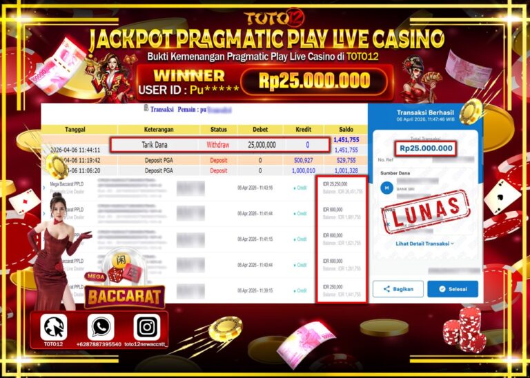 Selamat kepada Member Kami Pu***** Telah Jackpot dan berhasil mendapatkan kemenangan besar pada permainan JACKPOT SLOT GAME (MEGA BACCARAT PPLD) Dengan Kemenangan Sebesar Rp.25.000.000–. Setelah mengisi Fomulir Withdraw dengan Kurang waktu 1-2 Menit Dana sudah kami Trasnfer kepada Pemilik Userid dan dana sudah dapat di cairkan oleh pemenang. Bukti Pembayaran yang TOTO12 berikan merupakan Bukti Pembayaran…