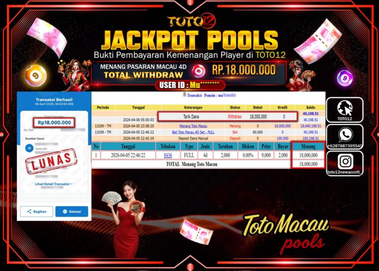 Selamat kepada Member Kami Mu****** Telah Jackpot dan berhasil mendapatkan kemenangan besar pada permainan JACKPOT POOLS PASARAN (MACAU 4D) Dengan Kemenangan Sebesar Rp.18.000.000–. Setelah mengisi Fomulir Withdraw dengan Kurang waktu 1-2 Menit Dana sudah kami Trasnfer kepada Pemilik Userid dan dana sudah dapat di cairkan oleh pemenang. Bukti Pembayaran yang TOTO12 berikan merupakan Bukti Pembayaran yang SAH…