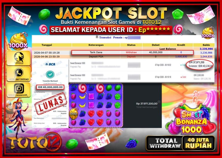 Selamat kepada Member Kami Ep***** Telah Jackpot dan berhasil mendapatkan kemenangan besar pada permainan JACKPOT SLOT GAME (SWEET BONANZA 1000) Dengan Kemenangan Sebesar Rp.40.000.000–. Setelah mengisi Fomulir Withdraw dengan Kurang waktu 1-2 Menit Dana sudah kami Trasnfer kepada Pemilik Userid dan dana sudah dapat di cairkan oleh pemenang. Bukti Pembayaran yang TOTO12 berikan merupakan Bukti Pembayaran…