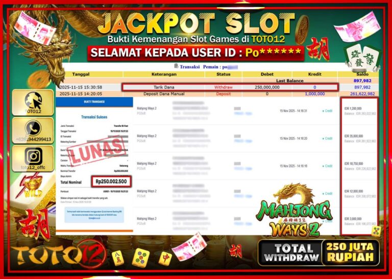 Selamat kepada Member Kami Po****** Telah Jackpot dan berhasil mendapatkan kemenangan besar pada permainan JACKPOT SLOT GAME (MAHJONG WAYS 2) Dengan Kemenangan Sebesar Rp.250.000.000 –. Setelah mengisi Fomulir Withdraw dengan Kurang waktu 1-2 Menit Dana sudah kami Trasnfer kepada Pemilik Userid dan dana sudah dapat di cairkan oleh pemenang. Bukti Pembayaran yang TOTO12 berikan merupakan Bukti…