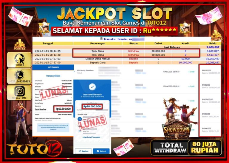 Selamat kepada Member Kami Ru****** Telah Jackpot dan berhasil mendapatkan kemenangan besar pada permainan JACKPOT SLOT GAME (WILD BOUNTY SHOWDOWN) Dengan Kemenangan Sebesar Rp.80.800.000 –. Setelah mengisi Fomulir Withdraw dengan Kurang waktu 1-2 Menit Dana sudah kami Trasnfer kepada Pemilik Userid dan dana sudah dapat di cairkan oleh pemenang. Bukti Pembayaran yang TOTO12 berikan merupakan Bukti…