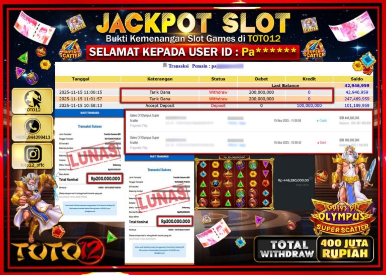 Selamat kepada Member Kami Pa****** Telah Jackpot dan berhasil mendapatkan kemenangan besar pada permainan JACKPOT SLOT GAME (GATES OF OLYMPUS SUPER SCATTER) Dengan Kemenangan Sebesar Rp.400.000.000 –. Setelah mengisi Fomulir Withdraw dengan Kurang waktu 1-2 Menit Dana sudah kami Trasnfer kepada Pemilik Userid dan dana sudah dapat di cairkan oleh pemenang. Bukti Pembayaran yang TOTO12 berikan…