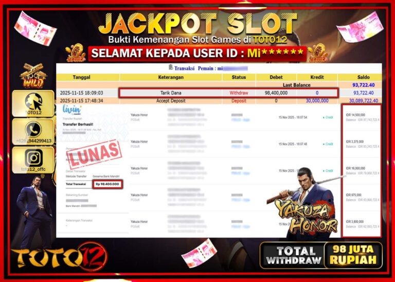 Selamat kepada Member Kami Mi****** Telah Jackpot dan berhasil mendapatkan kemenangan besar pada permainan JACKPOT SLOT GAME (YAKUZA HONOR) Dengan Kemenangan Sebesar Rp.98.400.000 –. Setelah mengisi Fomulir Withdraw dengan Kurang waktu 1-2 Menit Dana sudah kami Trasnfer kepada Pemilik Userid dan dana sudah dapat di cairkan oleh pemenang. Bukti Pembayaran yang TOTO12 berikan merupakan Bukti Pembayaran…