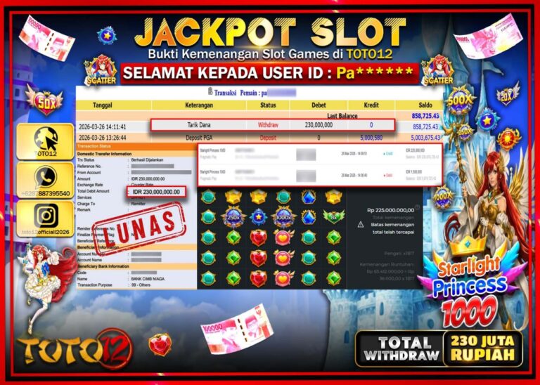 Selamat kepada Member Kami Pa**** Telah Jackpot dan berhasil mendapatkan kemenangan besar pada permainan JACKPOT SLOT GAME (STARLIGHT PRINCESS 1000) Dengan Kemenangan Sebesar Rp.230.000.000–. Setelah mengisi Fomulir Withdraw dengan Kurang waktu 1-2 Menit Dana sudah kami Trasnfer kepada Pemilik Userid dan dana sudah dapat di cairkan oleh pemenang. Bukti Pembayaran yang TOTO12 berikan merupakan Bukti Pembayaran…