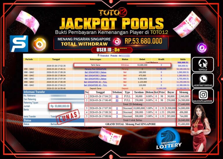 Selamat kepada Member Kami De***** Telah Jackpot dan berhasil mendapatkan kemenangan besar pada permainan JACKPOT POOLS PASARAN (SYDNEY) Dengan Kemenangan Sebesar Rp.53.680.000–. Setelah mengisi Fomulir Withdraw dengan Kurang waktu 1-2 Menit Dana sudah kami Trasnfer kepada Pemilik Userid dan dana sudah dapat di cairkan oleh pemenang. Bukti Pembayaran yang TOTO12 berikan merupakan Bukti Pembayaran yang SAH /…