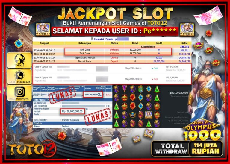 Selamat kepada Member Kami Pe***** Telah Jackpot dan berhasil mendapatkan kemenangan besar pada permainan JACKPOT SLOT GAME (GATES OF OLYMPUS 1000) Dengan Kemenangan Sebesar Rp.114.000.000–. Setelah mengisi Fomulir Withdraw dengan Kurang waktu 1-2 Menit Dana sudah kami Trasnfer kepada Pemilik Userid dan dana sudah dapat di cairkan oleh pemenang. Bukti Pembayaran yang TOTO12 berikan merupakan Bukti…