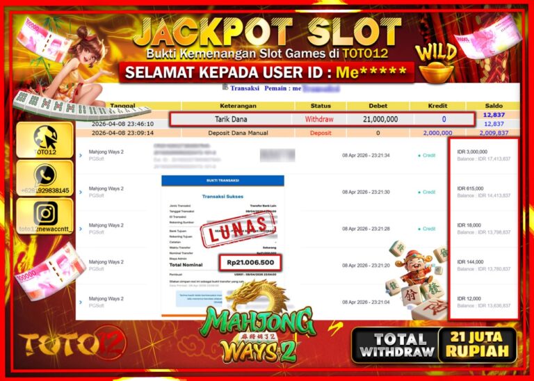Selamat kepada Member Kami Me***** Telah Jackpot dan berhasil mendapatkan kemenangan besar pada permainan JACKPOT SLOT GAME (MAHJONG WAYS 2) Dengan Kemenangan Sebesar Rp.21.000.000–. Setelah mengisi Fomulir Withdraw dengan Kurang waktu 1-2 Menit Dana sudah kami Trasnfer kepada Pemilik Userid dan dana sudah dapat di cairkan oleh pemenang. Bukti Pembayaran yang TOTO12 berikan merupakan Bukti Pembayaran…