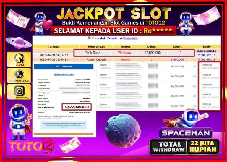 Selamat kepada Member Kami Re***** Telah Jackpot dan berhasil mendapatkan kemenangan besar pada permainan JACKPOT SLOT GAME (SPACEMAN) Dengan Kemenangan Sebesar Rp.22.000.000–. Setelah mengisi Fomulir Withdraw dengan Kurang waktu 1-2 Menit Dana sudah kami Trasnfer kepada Pemilik Userid dan dana sudah dapat di cairkan oleh pemenang. Bukti Pembayaran yang TOTO12 berikan merupakan Bukti Pembayaran yang SAH /…